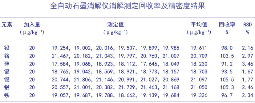 從上表所得,鉛、鉻、砷、鎘、錫、鋁、鐵7種金屬元素的加標回收率為91.2%~105.5%,測定結果的相對標準偏差為1.67%~3.46%,因此該方法適用于實驗要求,具有較高的準確度和精密度。