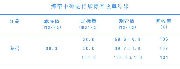 采用本方法對北京市售海帶、(6份)進行測定,測定結果為3次測定的平均值及標準偏差范圍,結果見表格。所測定海帶總砷含量范圍為21.8~56.7mg/kg符合實驗效果。