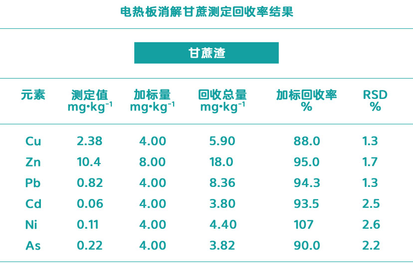由表中得出,實(shí)驗(yàn)測(cè)定值均在標(biāo)準(zhǔn)值范圍內(nèi),滿足實(shí)驗(yàn)要求,電熱板消解方法適用于甘蔗、植物等的消解。