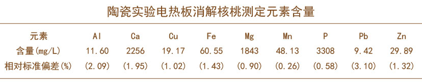 文章中通過陶瓷實(shí)驗(yàn)電熱板對(duì)核桃進(jìn)行常壓濕法消解,測(cè)定核桃中的無機(jī)元素含量,對(duì)重金屬含量分析提供經(jīng)驗(yàn)。實(shí)驗(yàn)電熱板消解方法安全、可靠,為核桃的營(yíng)養(yǎng)成分研究打開科學(xué)之路。