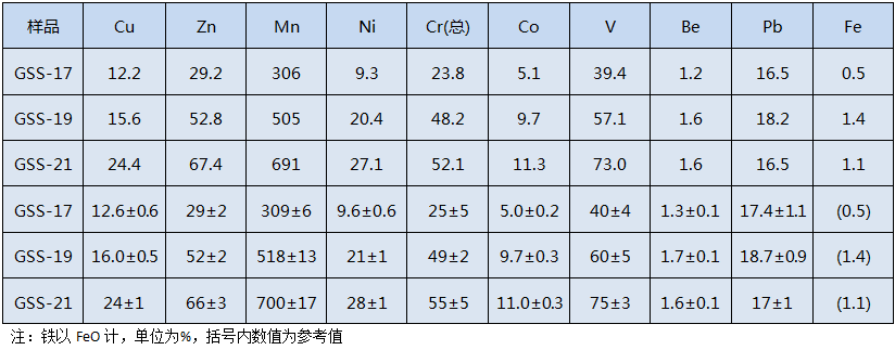 用HCl+HNO3+HF+HC104四酸全消解體系通過陶瓷電熱板濕法消解土壤樣品,進行3種不同加酸過程對GSS-17、GSS-19和GSS-21標準土壤樣品進行3次平行預處理,測定土壤中銅、鋅、錳、鎳、總鉻、鉆、釩、鈹、鉛、鐵l0種重金屬元素,結(jié)果如下表所示。