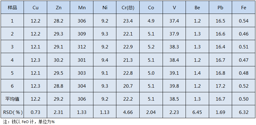 從上表結(jié)果得出,各元素的相對標準偏差在0.73%~6.45%之間,符合實驗室要求,方法適用于環(huán)境樣品預處理。